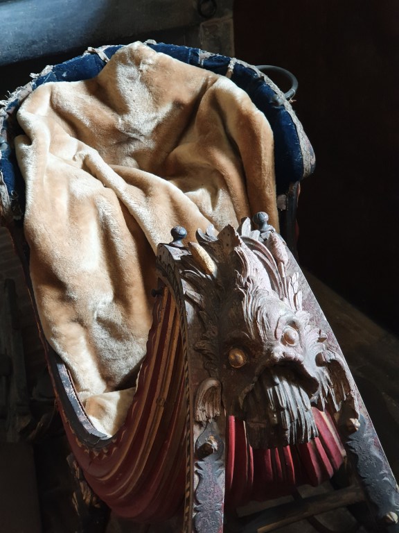 But the huge, almost monstrous fish that is being held by that man in the video has more of my attention, because I had seen that fish earlier, at the very beginning of my walk! Check out the sled that I took pictures of in the stables of the castle, that form the entrance of the garden…