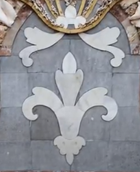 And then there is the Fleur-de-Lis, that we saw in the video. The Fleur de Lis is a very old and well-known symbol in heraldry. It’s a reminder of the Fleur-de-Lis ampulla that held the oil used to anoint Clovis I, king of the Franks, in the sixth Century. So it stood as a symbol of the king’s divinely approved right to rule. The thus “anointed” kings of France later maintained that their authority was coming directly from God. Inevitably, at some point in history, the fine line between seeing oneself as god given and considering oneself divine became particularly thin… (Louis XIV)