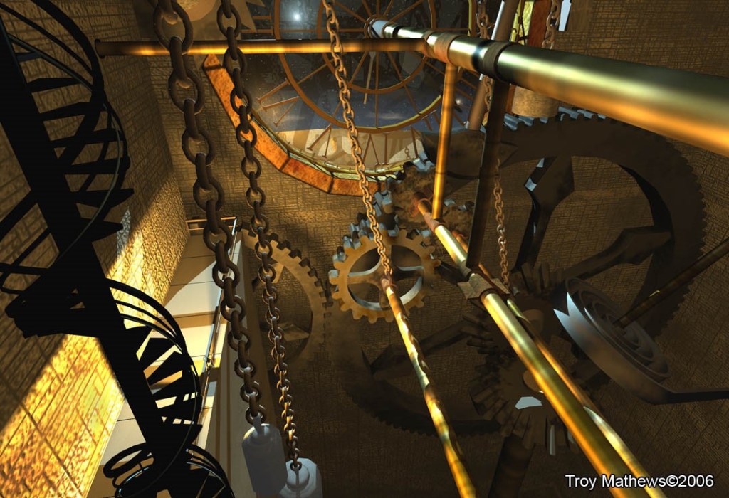 What catches my attention the most, though, is the clock, with its white dial and typical roman numerals. Next thing, I’m being carried in the spirit, toward the clock and right through the dial into the interior of the tower. For a few moments I’m floating about, inside the clockwork, seeing a dazzling construction of turning cogwheels, suspension bridges in perpetual motion, chain gear – drivers in different sizes with roller chains around them – all made of blinking gold and working in perfect synergy, like one oiled machine.