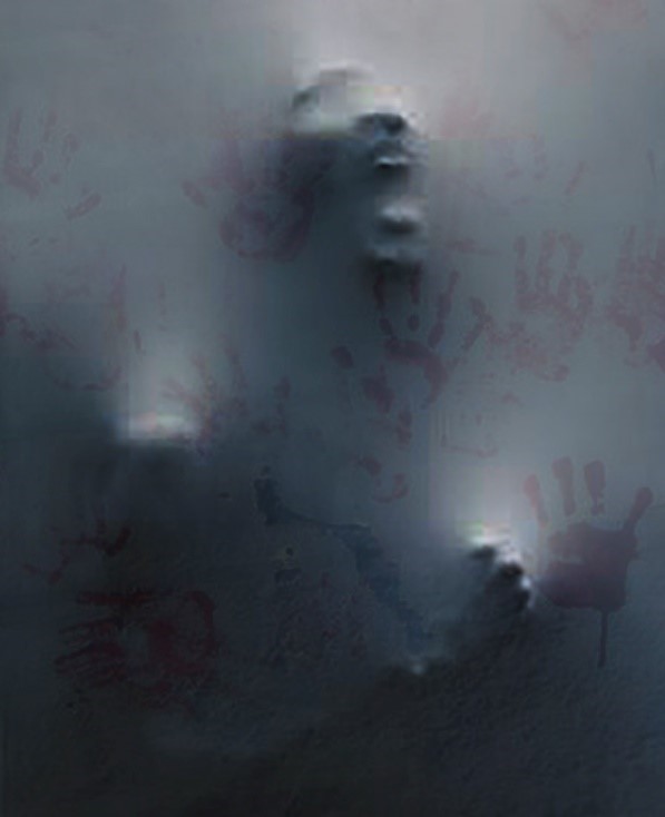 He glances at the wall behind him and also there, where first was nothing, now handprints in all sorts and sizes are mysteriously appearing. In reaction to that, flashes with images begin to interfere with what he’s seeing in real life – images of another wall, brighter than this one but also with dark red and brown handprints. Only those handprints are positioned in pairs, in a much tidier manner…